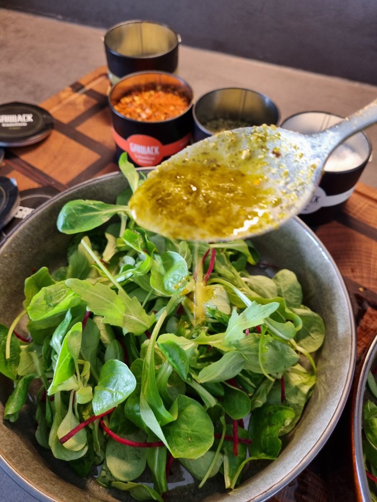 Den Salat dazu. Aus den Gewürzen, Olivenöl und dem Zitronensaft rührt ihr ein Dressing an und gebt das ebenfalls dazu: