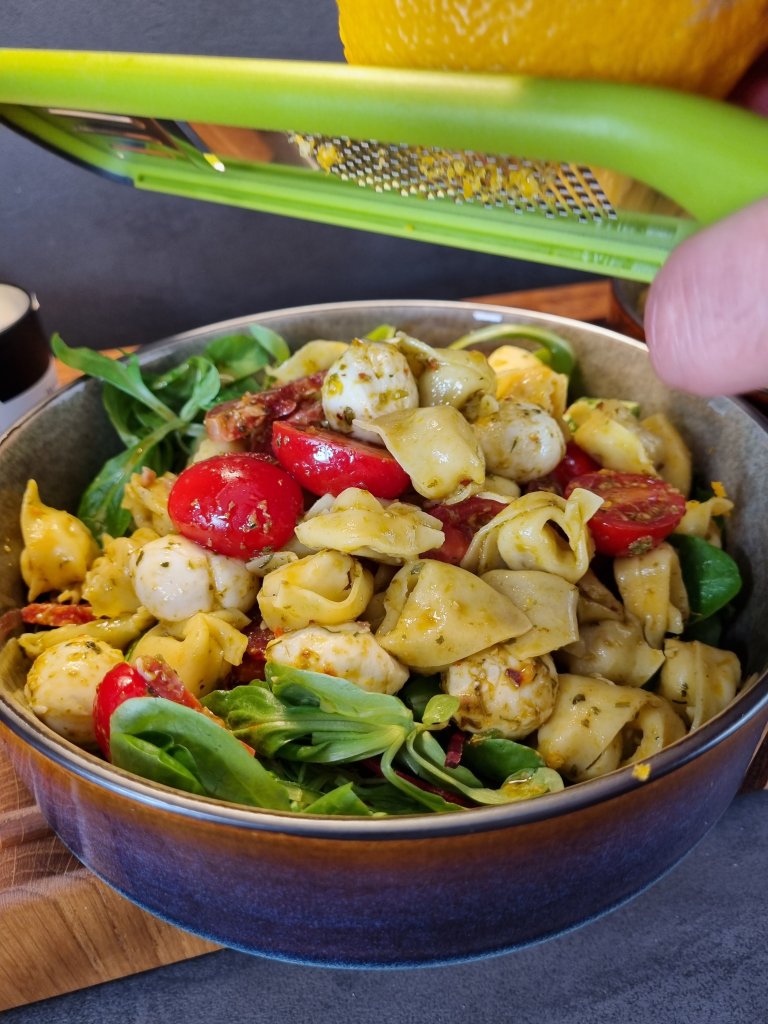 Tortellini finden in der italienischen Küche eher als Suppennudeln statt. Hier habe ich mit ein paar frischen Zutaten einen schnellen, leckeren und frischen lauwarmen Salat zusammengerührt. Getoppt mit gegrillten Feigen, die ein super Gegenspiel zu den herzhaften Zutaten darstellen.