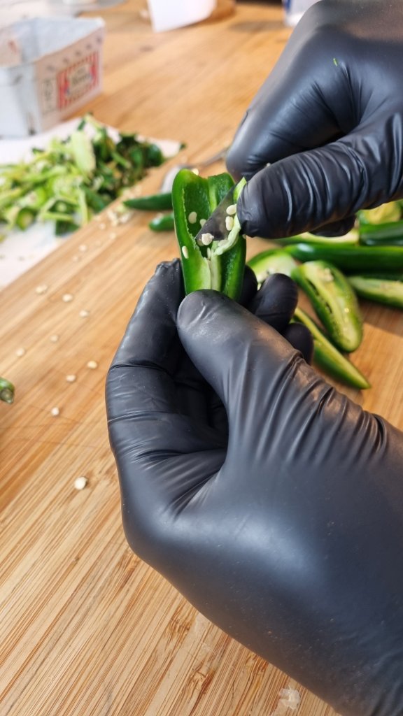 Am nächsten Morgen putzt und würfelt ihr die Jalapenos. Hier müsst ihr nach eignenm Geschmack vorgehen, da die Schärfe der Chilis immer unterschiedlich ist, würde ich maximal 80gr. pro kg nehmen, das sollte scharf genug sein. 😉