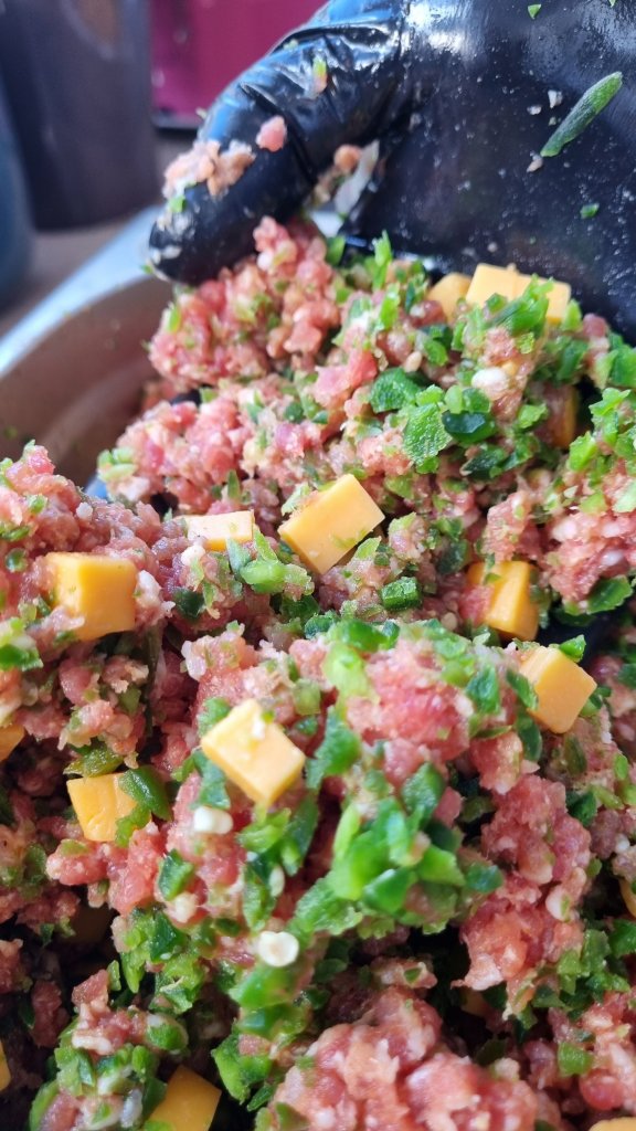 Nach dem wolfen kommt der Käse und die Jalapenos dazu. Das ganze wird dann gut durchgeknetet…