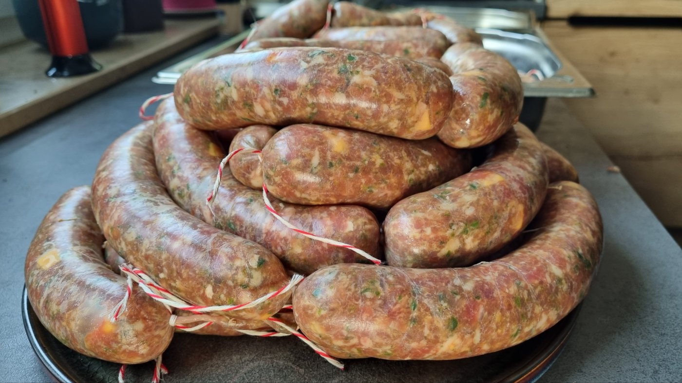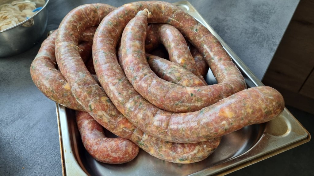 Danach wird gefüllt. Ich nutze hier wegen der großen Käse Stücke gerne Därme mit 28er Kaliber. Nach dem füllen, hänge ich die Würste zum trocknen zwei Tage in einem kühlen Raum auf.