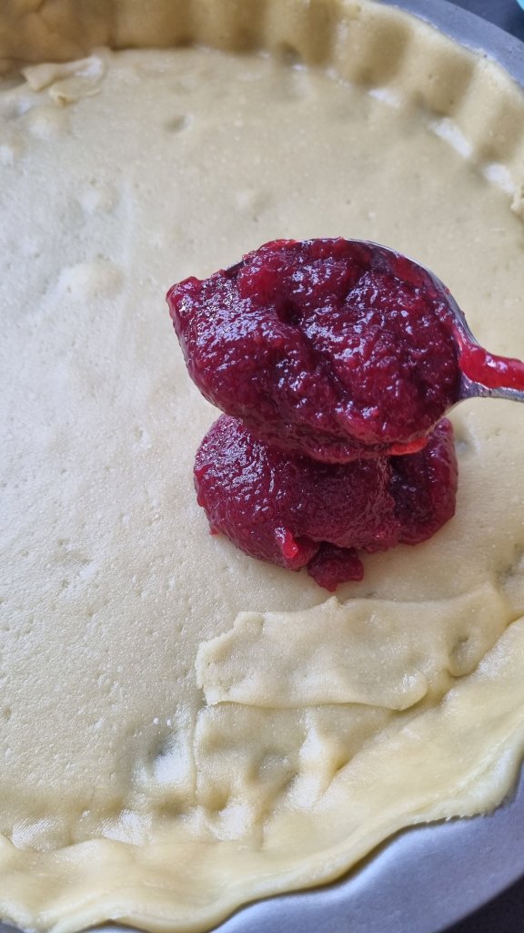 Dann verteilt ihr die Konfitüre auf dem Teigboden, bevor ihr mit dem Meditativen (oder nervigen) Teil weitermacht… 😉